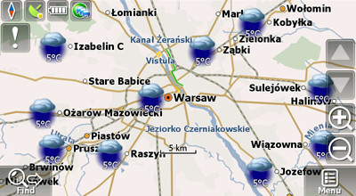Ein weiteres und nützliches Feature ist auch die Wettervorhersage, die man sich für die eigene Umgebung, aber auch für jede beliebige Stadt direkt auf dem Navi anzeigen lassen kann. Dieser Service ist ein Online-Service und erfordert demgemäß einen Datentarif.