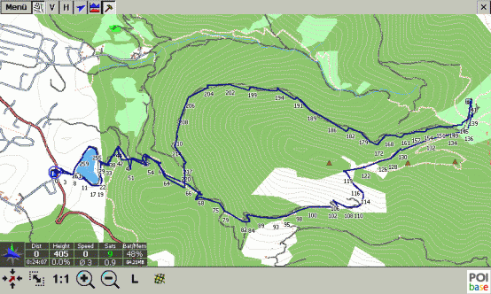 - Oben links wird während der Streckenplanung die bisherige Streckendistanz angezeigt. Diese Längenmessung kann später während der Navigation jederzeit eingesetzt werden und hat keinen Einfluss auf die einmal geplante Route (gerade während der Navigation eine sehr häufig hilfreiche Funktion!).