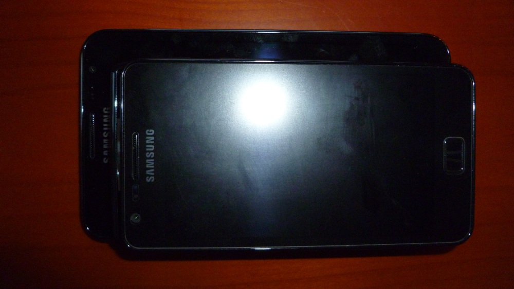 | Vergleichsgeräte im Bild: Samsung Galaxy Note unten bzw. links, Diätweltmeister Motorola RAZR mittig, Samsung Galaxy SII oben bzw. rechts |