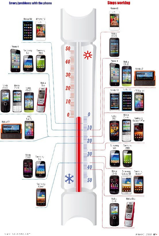 Bei einer Temperatur von 0°C funktionierte alle im Test genutzten Geräte einwandfrei. Bei -5°C meldete das iPhone 4S einen SIM-Fehler und das Nokia N9 einen leeren Akku. -10°C waren dem iPhone 4S dann offensichtlich bereits zu kalt und es schaltete sich aufgrund eines leeren Akkus ab und ließ sich auch nicht wieder einschalten