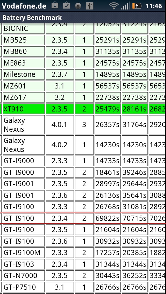 Der AnTuTu-Tester belastet die Smartphone-CPU mit verschiedenen Operationen, misst die Zeit, bis der Akku nur noch zu einem gewissen Prozentsatz gefüllt ist und vergleicht das Ergebnis mit anderen Geräten (zugegeben, nicht alle hoch aktuell). Bei diesem Test darf sich das RAZR hinten anstellen und landet hinter dem Samsung Galaxy SII und LG Optimus Speed mit jeweils etwas geringerer Akkukapazität. Ein weiterer Akku-Benchmark-Test schaltet der Reihe nach Verbraucher (GPS, WLAN, Bluetooth, Display, Lautsprecher) an und wieder aus, bis ein gewisser Batterie-Level erreicht. Die dann gemessene Durchhaltezeit gilt als Benchmark. Auch hier liegt das RAZR im unteren Durchschnitt.