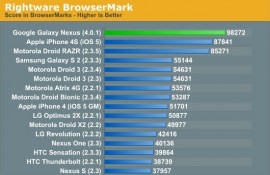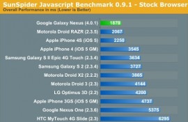 Bei der reinen Rechenleistung spielt das RAZR sein volles Potenzial aus und hängt in zwei Disziplinen das Samsung Galaxy SII locker ab, kann mit dem iPhone 4S mithalten und landet nur knapp hinter dem Samsung Galaxy Google Nexus mit dem neuen Android 4.0. Hier scheint sich nicht nur TIs CPU, sondern auch – wieder einmal – die Doppelkanal-Architektur zu bewähren. Ob solche Zahlenspiele für den durchschnittlichen Nutzer erlebbar und bedeutsam sind, steht auf einem anderen Blatt.