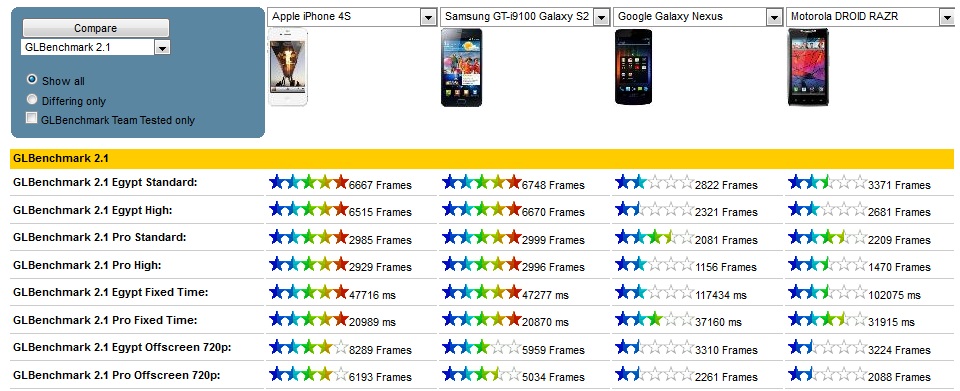 Für eine gute Vergleichbarkeit ist der Offscreen-Test besonders zu beachten, denn nur er bedenkt alle Geräte mit derselben Auflösung. Wer es selbst probieren möchte: GLBenchmark 2.1 ist für Auflösungen bis HD 720p gut, Full-HD 1080p benötigt die kommende Version 2.5. Die Android-Version ist im Market kostenlos erhältlich und kann nach Registrierung genutzt werden. Apple-iOS-Nutzer müssen im AppStore 4 EUR berappen.