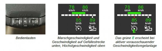 Mithilfe der Lenkradtasten stellt der Fahrer vor Fahrtantritt die Marschgeschwindigkeit und die Geschwindigkeit für das Befahren von Gefällestrecken ein. Die berechnete Geschwindigkeit des Active Prediction Tepomats wird dann im Display oben angezeigt und beim Eingriff des Systems erscheint im Display ein grünes E.