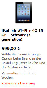 Wer aktuell versucht ein iPad über Apples Webseite vorzubestellen, bekommt eine Lieferzeit von 2 – 3 Wochen angezeigt, unabhängig davon, welche Ausstattung gewählt wird.