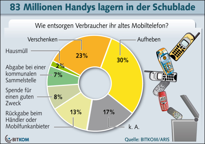 Tatsächlich sollen rund 83 Millionen alte Mobiltelefone ungenutzt in Schubladen und Kellern deutscher Haushalte liegen (siehe Grafik unten). Um die 66 Prozent der Verbraucher in Deutschland hätten ein oder mehrere Mobiltelefone, die sie nicht benutzen, so Bitkom.