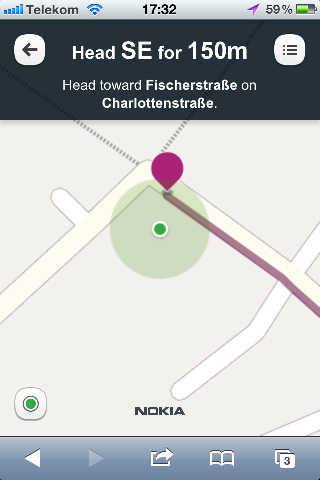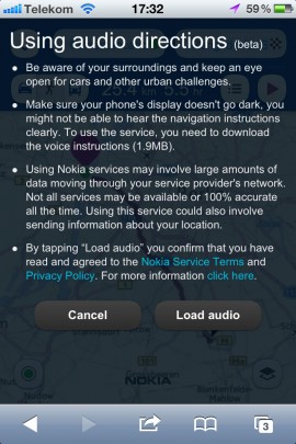 Nokia Maps lässt sich ganz einfach auf einem Smartphone mit einem HTML5-fähigen Browser über die Internetadresse http://m.maps.nokia.com starten. Der Nutzer kann die dort zur Verfügung stehende Anwendung dann zur Standortsuche und als Navigationssoftware verwenden. Um sich bei der Fußgängernavigation Abbiegehinweise ansagen zu lassen, muss eine kleine Audio-Datei heruntergeladen werden, die aktuell auch nur in englischer Sprache zur Verfügung steht.