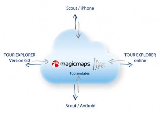 Grundlage ist der neue MagicMaps Live Service, der sämtliche Streckendaten eines Benutzers auf alle angemeldeten Geräte verteilt. Wer also eine Tour mit seinem iPhone oder Android-Smartphone über die MagicMaps Scout Software aufzeichnet, findet diese anschließen auch auf dem heimischen PC in der Tour Explorer Software wieder. Das Selbe funktioniert natürlich auch auf umgekehrten Wege: Mit dem Tour Explorer geplante Touren werden automatisch mit MagicMaps Live synchronisiert und stehen dann auf dem Smartphone zur Verfügung. Das manuelle Übertragen zwischen PC und Smartphone entfällt damit.