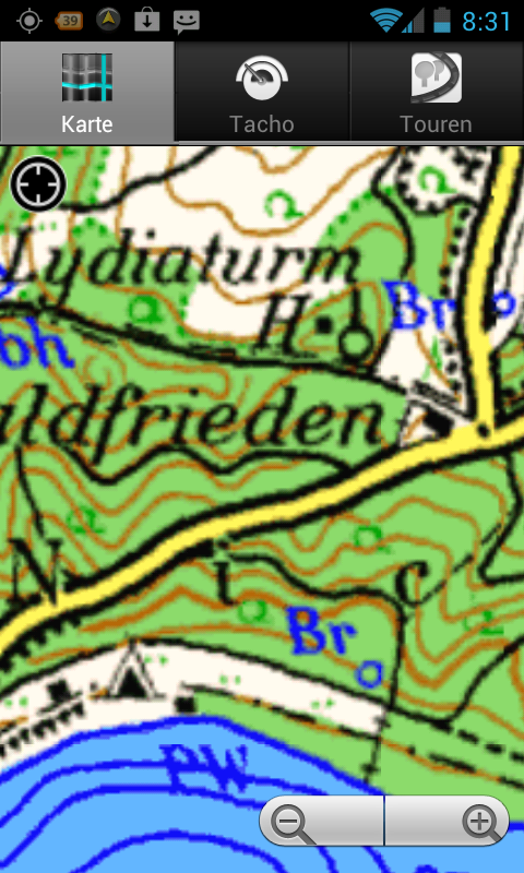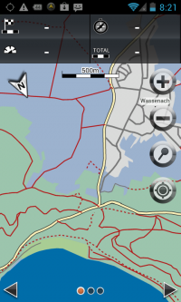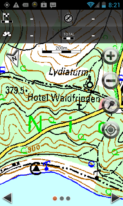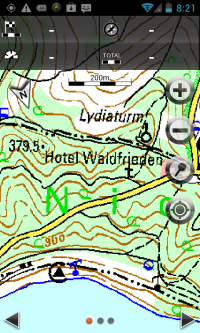 Bei Rasterkarten handelt es sich letztendlich um Bilddateien. Für die optimale Darstellung in allen Zoomstufen werden gute Algorithmen und einiges an Rechenleistung benötigt. Wenn man aus der Karte herauszoomt (zur Übersicht), wird die Karte sehr schnell zum Pixelsalat, welcher kaum noch zu nutzen ist. Hier hat die MEDION App noch deutlichen Verbesserungsbedarf. Ein Ausweg kann die Nutzung der 1:100.000 Karte sein. Die Stärke der MEDION Topo ist jedoch ganz klar die Nahansicht der Karte ab 100m. Auf Nachfragen wurde uns von MEDION jedoch angedeutet, dass an der Darstellung in mittleren und hohen Zoomstufen noch gearbeitet wird.