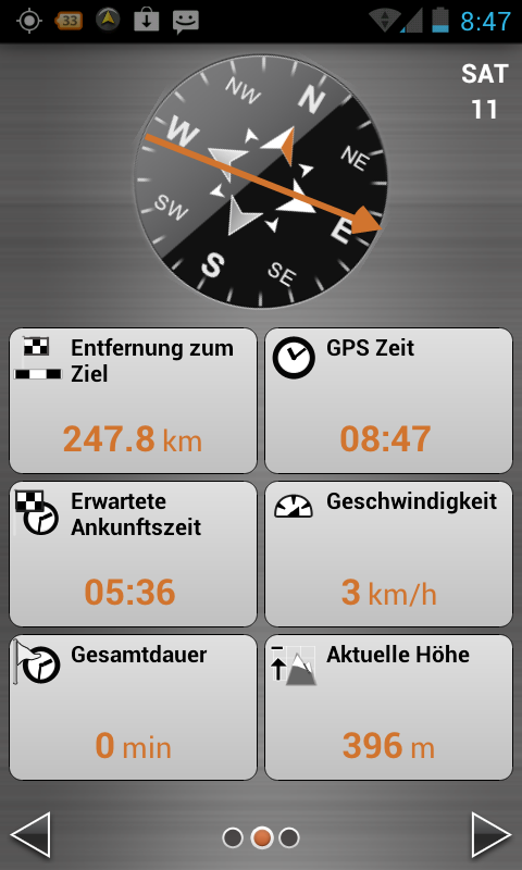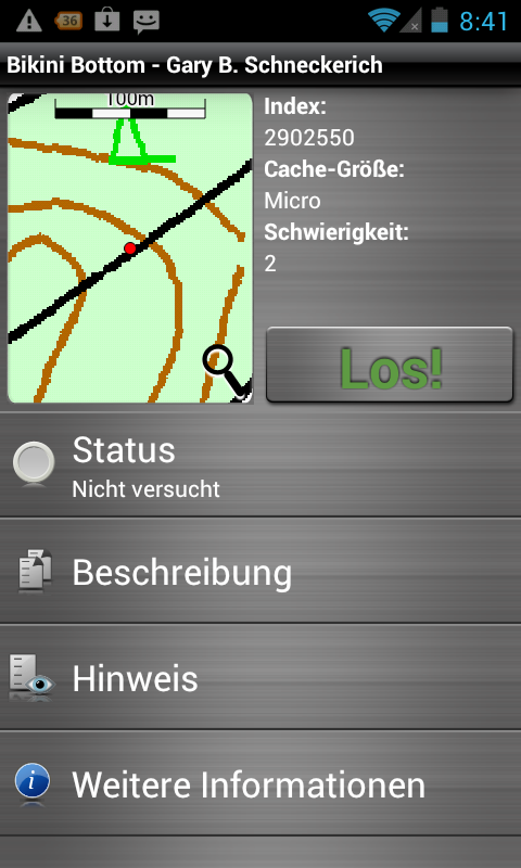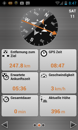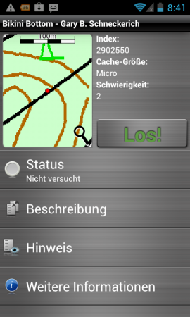 Weiter kann zu den im Listing aufgeführten Koordinaten navigiert werden. Hierbei erhält der bereits erwähnte Kompass im zweiten Navigationsscreen besondere Bedeutung. Denn dieser zeigt dem User / Cacher die Richtung zum Versteck. Die bekannten Geocaching-Tools, welche dem S3857 mittels Update spendiert wurden, fehlen der Android-Version jedoch genauso, wie die Möglichkeit eine Position anzupeilen. Kleinigkeiten, die wie das Übertragen von gefundenen Caches an geocaching.com noch auf der Wunschliste stehen.