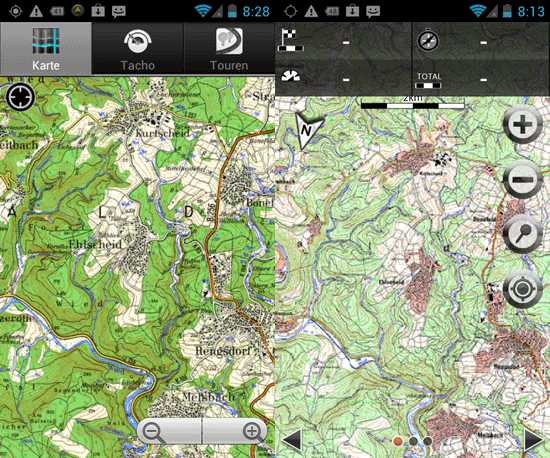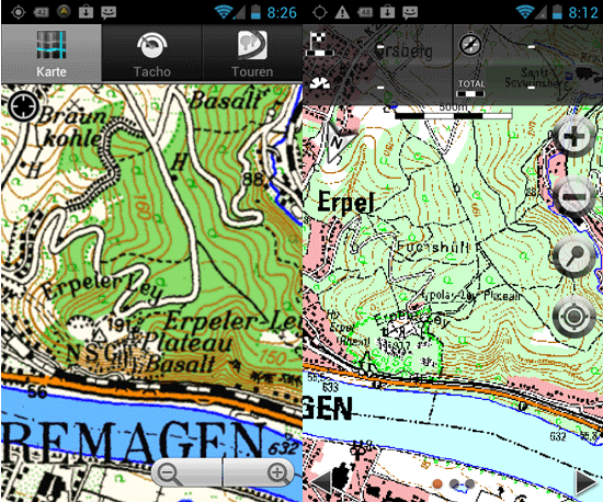 Zum besseren Vergleich haben wir hier einmal die OSM, die BKG und eine MagicMaps Karte (aus einer anderen Software) direkt gegenüber gestellt. Die genannten Unterschiede sind deutlich erkennbar. Die Mischung aus OSM und Topo-Karte bringt je nach Nutzung entsprechende Vorteile. Deutlich zu sehen, in hohen und mittleren Zoomstufen ist die Darstellung der MEDION Topo gegenüber der Konkurrenz (MagicMaps) schlechter, in niedrigen Zoomstufen hingegen zeigt die MEDION Topo das schärfere Bild, mehr Details und vor allem aktuellere Daten (muss nicht für ganz Deutschland repräsentativ sein).
