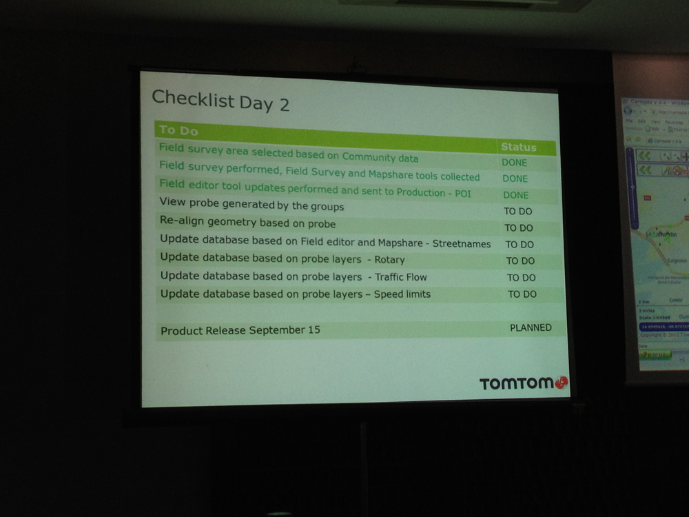 Nach der gestrigen „Arbeit auf der Straße“ erfolgte heute die Weiterverarbeitung der Daten über das TomTom Tool Cartopia. Hier laufen aller gesammelten Informationen zusammen, dazu gehören auch die Daten die TomTom Nutzer beim Fahren mit ihren Geräten sammeln und bei der Verbindung mit dem Computer an den TomTom Server übertragen. Mit sogenannten Probes lassen sich dann beispielsweise neue Straßen ausmachen oder Kreisverkehre und Einbahnstraßen erkennen.