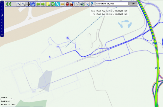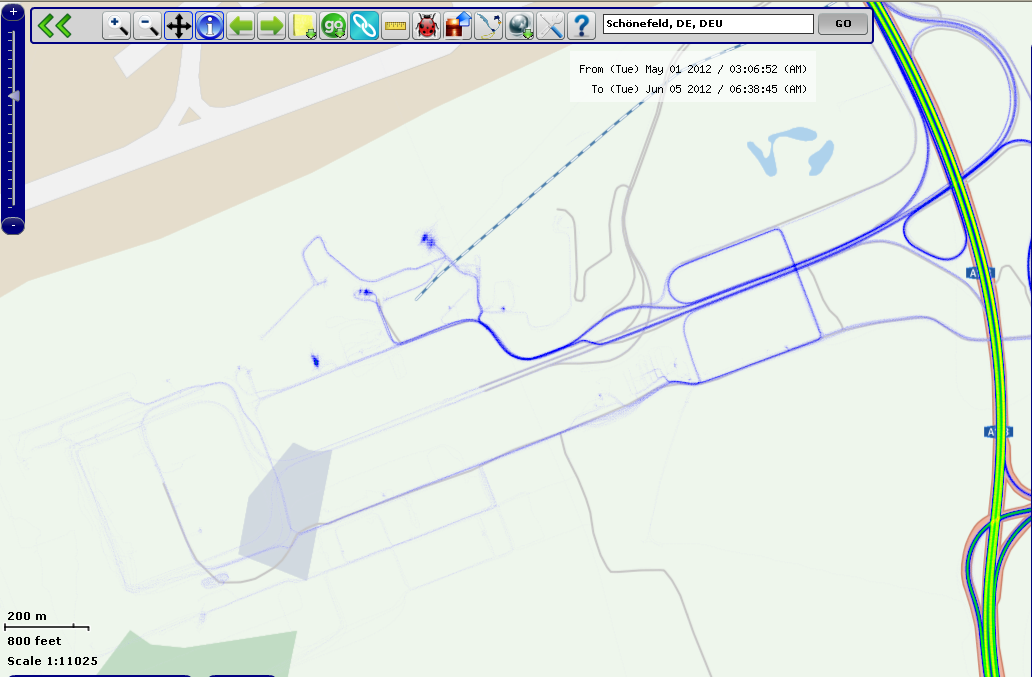 Auf dem Bild ist deutlich zu erkennen, dass Mitarbeiter des Flughafens oder Bauarbeiter bereits die neu angelegten Straßen nutzen und Sie durch die Probes in Cartopia sichtbar sind. Um anhand von Probes eine neue Straße zu erfassen, benötigt TomTom jedoch eine weitaus höhere Anzahl als beim Beispiel Schönefeld derzeit vorliegt.