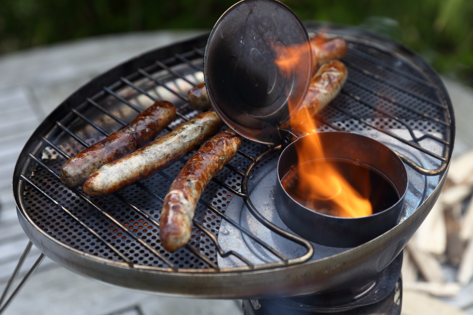 Das Grillen über offener Holzflamme hat jedoch einen erheblichen Nachteil: auch wenn die Verbrennung dank reichlich Sauerstoffzufuhr nahezu rauchfrei abläuft, die Flammen erzeugen Ruß, welcher sich auf dem Grillgut niederschlägt. Legt man Grillgut auf, zeigt sich bereits nach kurzer Zeit ein schmieriger Rußfilm, der beim Grillen auf Holzkohle so nicht zu beobachten ist. Der Rußfilm wird zwar irgendwann durch die Bräunung des garen Fleisches überdeckt, aber Geschmack und die Gesundheit können dennoch unter der hohen Rußbelastung leiden. Die höhe der Belastung hängt unter anderem vom verwendeten Holz ab. Ein Vorteil des BioLite ist es jedoch, dass man nahezu alles verfeuern kann was man unterwegs so findet, verwendet man jedoch den Grill, sollte das Holz gut ausgewählt und wirklich trocken sein. Auch das rechtzeitige Nachlegen des Holzes ist beim Grillen noch wichtiger. Das BioLite verbrennt nur dann verhältnismäßig raucharm, wenn das Holz regelmäßig alle 1-2 Minuten nachgelegt wird. Verpasst man diesen Zeitpunkt, geht die Flamme aus und das BioLite räuchert das gute Fleisch derart ein, dass es nahezu ungenießbar wird. Im Klartext: ein paar Sekunden nicht aufgepasst und die Grillsession geht im Rauch unter.