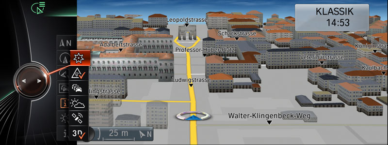 Auch an der Navigationsanwendung hat BMW gearbeitet. Für eine bessere Orientierung schon während der Zieleingabe zeigt das System im Splitscreen den ausgewählten Ort auf einer Übersichtskarte an. Aus der Karte heraus lassen sich über das sogenannte PIE-Menü nun zahlreiche Informationen aufrufen. Je nach hinterlegten Informationen kann sich der Fahrer Sonderziele in der Umgebung anzeigen lassen, vorhanden Details dazu einsehen, die Zielführung dorthin starten, die Kartenansicht ändern sowie den aktuellen Standort oder den aktuellen Zielort anzeigen lassen. Die aus der Navigationsansicht bekannte Funktionsleiste kann beim neuen Navigationssystem Professional erweitert werden und bietet jetzt Zugriff auf weitere wichtige Optionen, die sich der Nutzer früher durch umständliches Durchhangeln durch das Menü heraussuchen musste.
