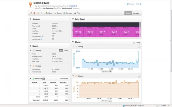 Die Uhr Liefert damit Informationen zum Schwimmstil, der Geschwindigkeit und Pace, der geschwommenen Distanz, der Schlaganzahl, der Schlagfrequenz, der Zugdistanz, dem SWOLF Effizienz-Score (Zahl der Schläge + Zeit pro Bahn), dem Kalorienverbrauch und der Anzahl der geschwommenen Bahnen. Für einige Berechnungen muss der Nutzer vor dem Training oder Wettkampf Informationen im eigenen Benutzerprofil hinterlegen und um die geschwommenen Bahnen zählen zu können muss der Swim zuvor die Länge mitgeteilt werden.
