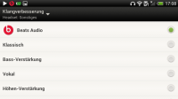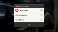 Der Audioplayer (App Musik) versteht sich auf die Formate .aac, .amr, .ogg, .m4a, .mid, .mp3, .wav und .wma (Windows Media Audio 9). Klangverbesserungen bietet das One X ausschließlich über Kofpfhörer, davon aber eine ganze Fülle. Als wichtigstes Soundprofil ist Beats by Dr. Dre Audio zu nennen, das HTC schon seit einiger Zeit seinen Spitzengeräten mitgibt und ein „umfassendes und authentisches Sounderlebnis“ gewährleisten soll. Beats Audio funktioniert zwar mit jedem Kopfhörer, ist aber auf die mitgelieferten Spezial-Kopfhörer optimiert (fehlten leider beim Testgerät).