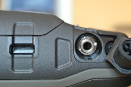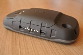 Bereits bekannt ist der Verschluss der Akkuabdeckung, dieser wurde bereits bei den ersten etrex-Modellen verwendet. Hervorragend gelöst ist die Art der Stromversorgung. Denn das Garmin Montana 650t kann neben 3 herkömmlichen AA-Batterien auch mit NiMH-Akkus oder mit dem im Lieferumfang beiliegenden Lithium-Ionen-Akkupack betrieben werden. Ein weiter Vorteil besteht in der Möglichkeit, den 2000 mAh starken Lithium-Ionen-Akkupack im Gerät zu laden. Dies geschieht über den miniUSB Anschluss, der sich neben dem Anschluss für eine externe GPS Antenne und dem Stereokopfhöreranschluss, auf der Rückseite unter einer Gummiabdeckung befindet. Nicht zu Übersehen sind die Kontakte für die Gerätehalterung auf der linken Geräteseite, über die das Montana 650t ebenfalls, je nach spezifischer Halterung, geladen werden kann.