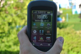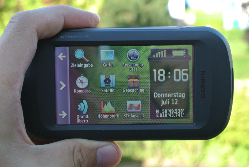 Auch das Display des Montana650t präsentiert sich in gewohnt guter Qualität, wobei besonders die frei wählbare Ausrichtung hervorsticht. Je nach Neigung kann das Gerät so im Hoch- oder Querformat betrieben werden. Der 4 Zoll große transflektive TFT-Touchscreen bietet eine Auflösung von 272 x 480 Pixel und gibt 65.000 Farben wieder. Damit verfügt er über einen guten Kontrast und ist auch bei direkter Sonneneinstrahlung gut ablesbar, wobei es unter einem bestimmten Neigungswinkel zu leichten Spiegelungen kommen kann.
