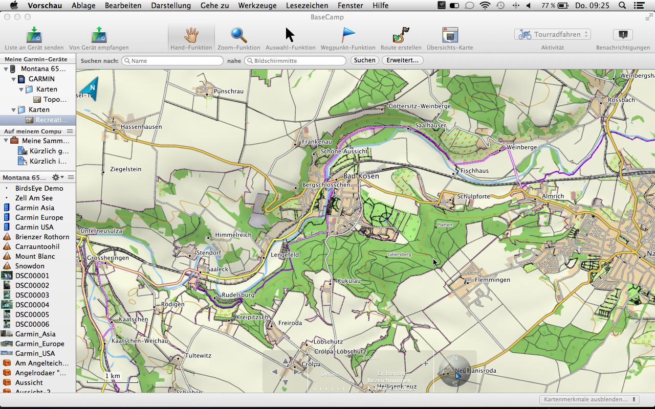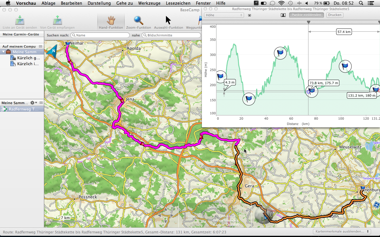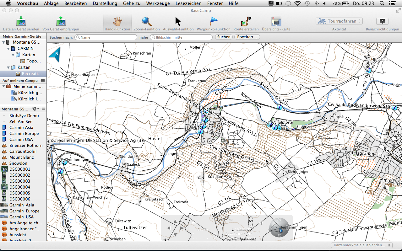 Mit der Tourenplanung kommen wir nun auch schon zum nächsten Abschnitt. Die Garmin Topo 2012 Pro beinhaltet 70.000 km Rad- und 30.000 km Wanderwege des ADFC und des DWV, sowie suchbare Ausflugsziele des Bett Bike Partner des ADFC. Diese Ziele können zum einem direkt über das Gerät (in unserem Fall der Garmin Montana 650t) oder auch über die PC-Software Garmin BaseCamp gesucht und ausgewählt werden. Letztere Möglichkeit ist natürlich weitaus komfortabler und übersichtlicher gestaltet. So können bequem Informationen zu Länge, Verlauf und Höhenprofil eingesehen werden.