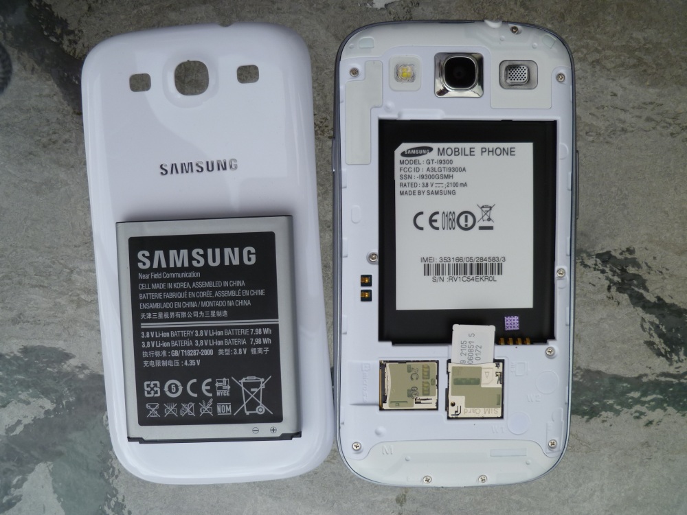 Gegenüber seinem Vorgänger Galaxy SII sind Abmessungen (137 x 71 x 8,6 mm) und Gewicht (133 g) leicht gewachsen, dafür nimmt das Galaxy SIII aber wesentlich mehr Technik und ein enormes Display auf, sodass die Gehäuse-Effizienz noch gesteigert wurde. Das leicht gebogene Design mit der silberfarbenen Kunststoffumrandung ist natürlich Geschmackssache. Einige Kritiker nörgelten, dass das SGS3 nicht so wertig wie einige Konkurrenzprodukte aussähe. Es ist aber nicht so, dass Samsung das nicht hinbekäme, vielmehr haben die Koreaner typischerweise diesen Aspekt zugunsten der Gewichtsersparnis zurücktreten lassen und leichten, dennoch widerstandsfähigen Kunststoff verbaut. Schön ist, dass das Gehäuse geöffnet werden kann, um z.B. den Akku, die MicroSIM oder die MicroSD zu wechseln. Die Konkurrenz von HTC, Motorola oder Apple setzt leider zunehmend auf geschlossene Gehäuse.