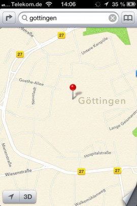 Im historischen Stadtzentrum von Göttingen soll es laut Spiegel-Online für Fußgänger nichts zu entdecken geben. Dem ist nicht so, denn wie in der Karten App üblich, muss näher herangezoomt werden, damit Fußgängerwege sichtbar sind. Diese Verfahrensweise macht auch durchaus mehr Sinn, als dauerhaft alle Straßen und Wege anzuzeigen.
