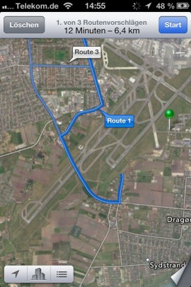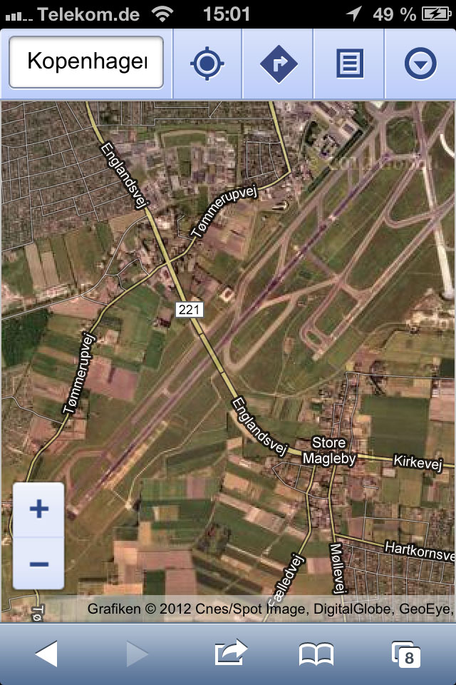 Auch beim Flughafen von Kopenhagen wird dem Apple Kartenmaterial ein Fehler angedichtet. Angeblich soll einen die App auf dem Weg ins Stadtzentrum direkt über das Rollfeld leiten. Wer etwas genauer hinschaut, erkennt jedoch, dass der Englandsvej auf der einen Seite des Rollfeldes in einem Tunnel weiterläuft und auf der anderen Seite (wer hätte das gedacht) wieder hinausführt.