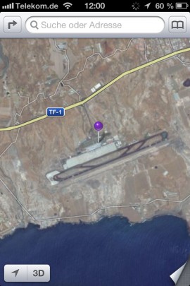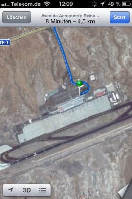 Spiegel-Online wirft der Karten App vor, auf Teneriffa die Zufahrtsstraße zum Insel eigenen Flughafen nicht zu kennen. Der Fehler wurde allerdings beim Aufnehmen des dort gezeigten Screenshots gemacht, denn wer näher in die Karte hereinzoomt, erkennt, dass die Straße sehr wohl vorhanden ist. Auch eine Routenberechnung vom Ausgang des Terminals zu einer beliebigen Adresse ist problemlos möglich.