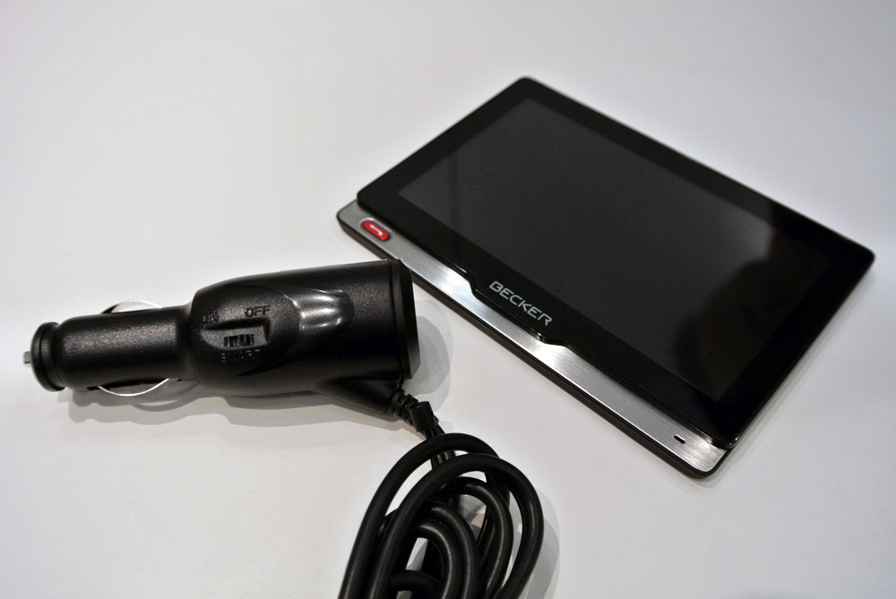 Der Becker ModuClick ist jedoch mehr als nur ein einfacher Windschutzscheibenhalter, in ihm verbirgt sich die komplette Hardware des Navis – Prozessor, Arbeitsspeicher, GPS-Antenne und diverse Anschlüsse für eine Rückfahrkamera, Audiokabel oder Multimediageräte sind hier untergebracht. Das aus kapazitivem Echtglas und gebürstetem Edelstahl bestehende Bedienelement wird an der ModuClick-Einheit ganz einfach angesteckt und von einem starken Magneten gehalten. Was an das Konzept vieler Autoradios erinnert, hat auch bei Navigationsgeräten einen klaren Vorteil: Während der größere Teil des Gerätes für Langfinger nutzlos im Auto verbleibt, wird das Display einfach in die Tasche gesteckt. Auch an einem neuen, zum Patent angemeldeten Ladekabel wurde gearbeitet, das über einen Schalter verfügt, mit dem das automatische Ein- und Ausschalten des Navis angepasst an die Zündung des Fahrzeugs geregelt werden kann.