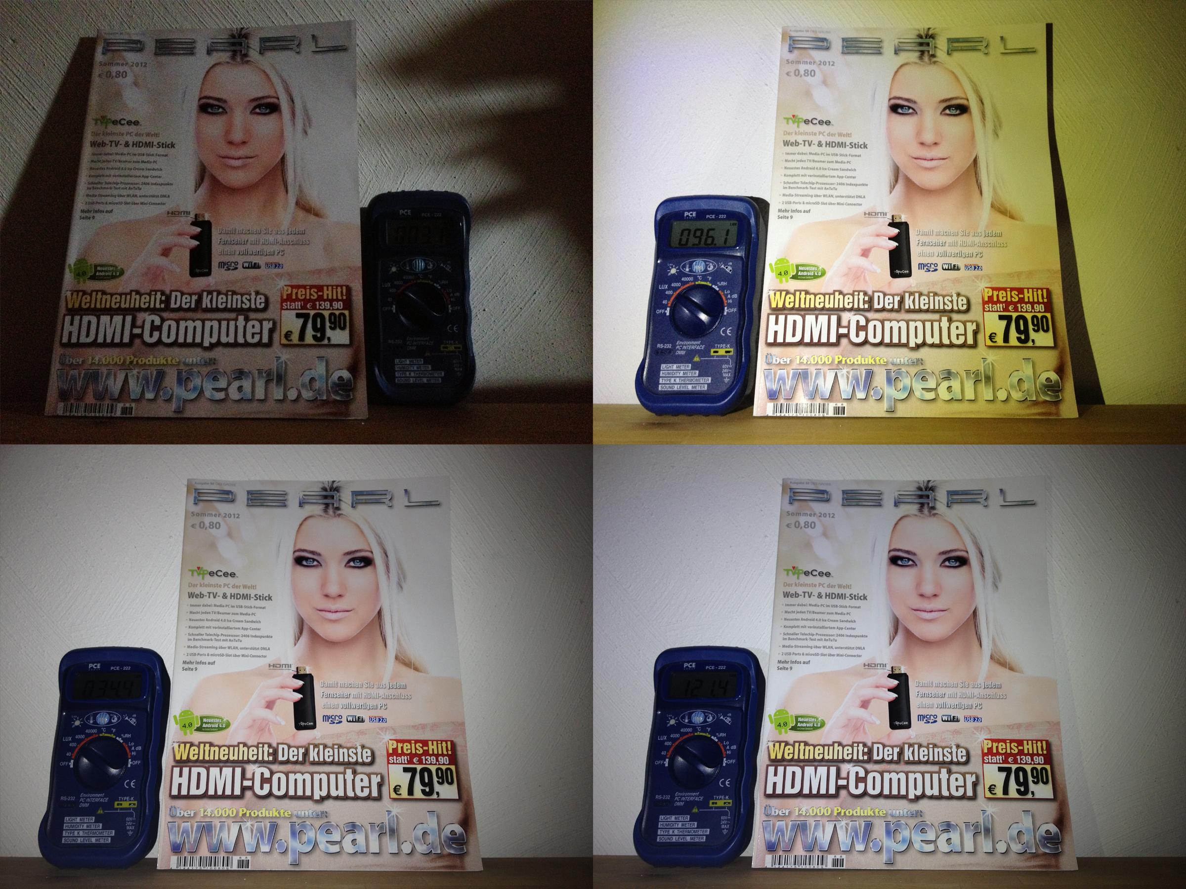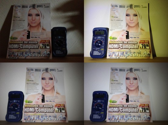 Rechts unten: Callstel LED + iPhone 4 LED, hell (121 Lux), etwas kühl, gleichmäßiger