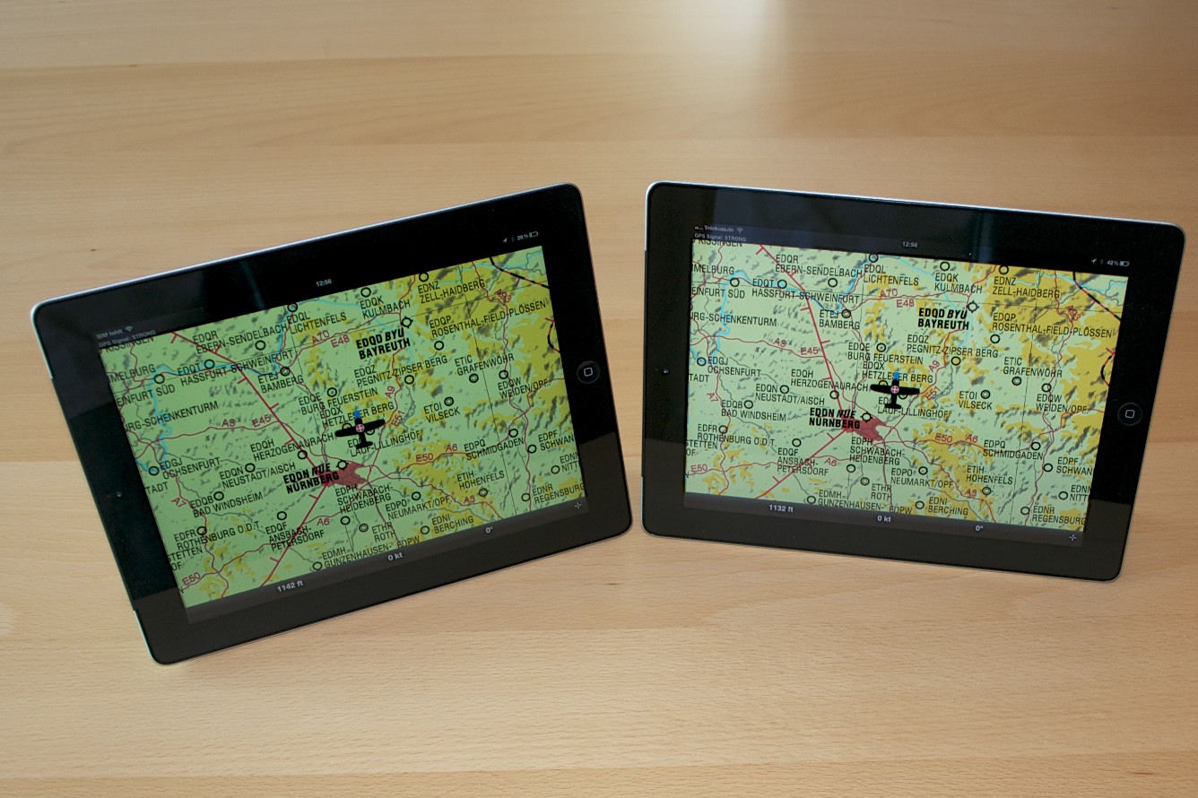 Fliegen: Das iPad ersetzt hier ein Moving-Map-System mit großem Display. Im Bereich der gewerblichen Luftfahrt in den USA wurde das iPad mit dem entsprechenden Kartenmaterial von der FAA bereits als offizielles Navigationssystem und Ersatz für die Papierkarte zugelassen, in Deutschland darf man es nach wie vor nur als Ergänzung einsetzen. Durch das große Display sind auf den ersten Blick die relevanten Informationen sofort erkennbar.