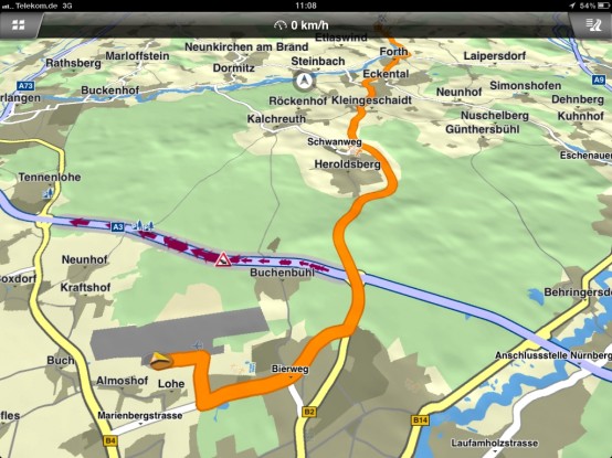 Als klassische Anwendungsbeispiele für Straßennavigation lassen sich stellvertretend die Apps von NAVIGON oder TomTom nennen. Durch die große Bildschirmdiagonale spielt beispielswiese PanoramaView 3D bei NAVIGON erst seine ganzen Stärken aus. Zum Testzeitpunkt waren zwischen iPad-2-Display und dem Retina-Display des neuen iPads keine großen Unterschiede bei der Kartendarstellung erkennbar. Dies wird sich sicherlich noch ändern, wenn die Hersteller ihre Programme wirklich für das Retina-Display optimieren.