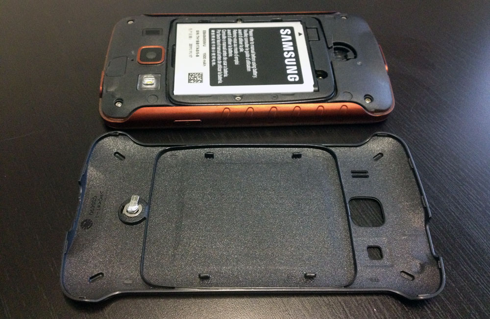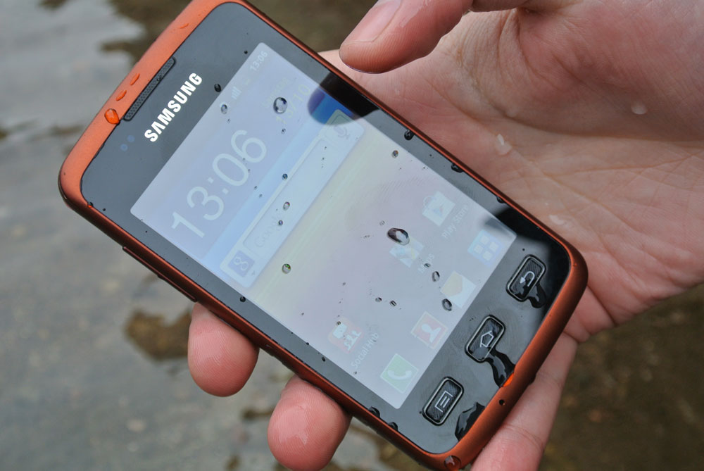 Das Gehäuse des Samsung Galaxy Xcover ist nach IP67 Zertifizierung vor dem Eindringen von Staub und Wasser sowie vor Stößen geschützt. Es kann sogar Tauchgängen in einer Tiefe von bis zu einem Meter für 30 Minuten standhalten, was wir nach unseren Tests bestätigen können (siehe Video). Die Bauart des Gerätes ist ansonsten auch sehr robust. Alle Eingänge sind durch „Stöpsel“ verschlossen und das Display ist aus besonders kratzfestem Sekurit-Glas gefertigt. Die Abdeckung auf der Rückseite ist so gestaltet, dass sie rutschhemmend wirkt und damit die Wasserdichtigkeit auch bei rauem Umgang erhalten bleibt, außerdem lässt sie sich mit einem Drehverschluss verriegeln. Für eine noch bessere Griffigkeit sorgen kleine Vertiefungen an den Seiten des Gehäuses. Wer das Samsung Galaxy Xcover also für Outdoor-Aktivitäten einsetzen möchte, bei denen es auch mal aus der Hand gleiten kann, muss sich nicht noch um eine Schutzhülle Gedanken machen.