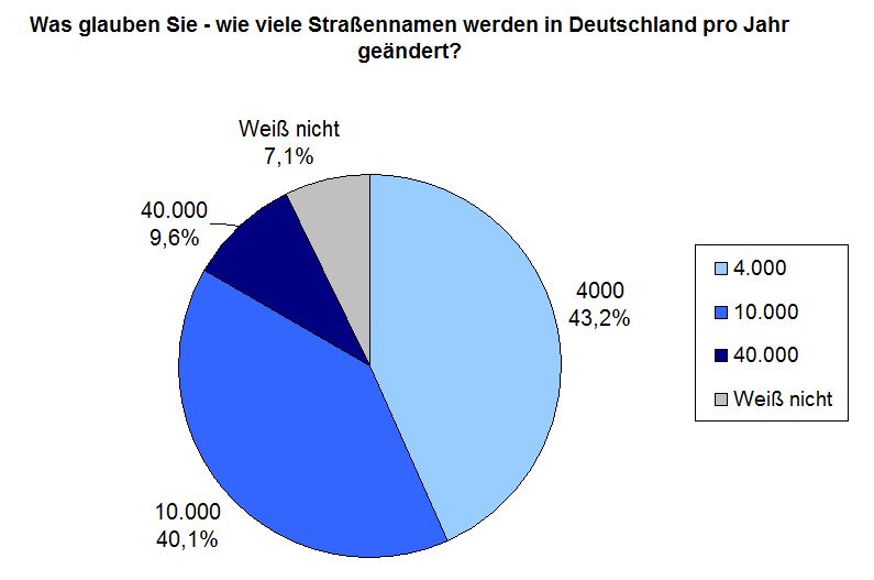 Ein Großteil der befragten gab zudem eine falsche Einschätzung bei der Frage, wie viele Straßenkilometer ihrer Meinung nach im Jahr allein in Deutschland geändert werden. Fast 90 Prozent sich nicht vorstellen, das sich hierzulande jährlich über 100.000 Straßenkilometer ändern und fast ebenso viele Straßennamen neu vergeben werden.