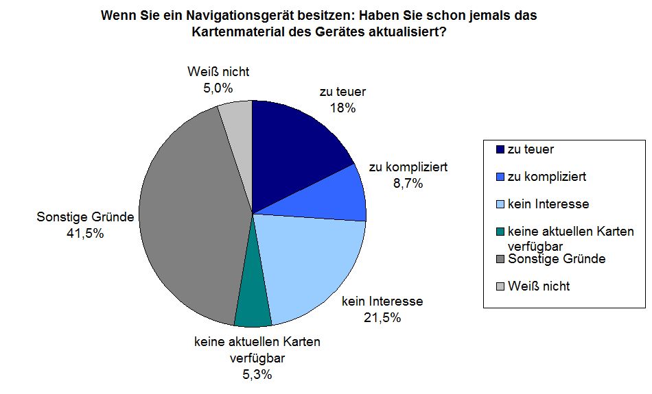Lediglich knapp ein Drittel (35,4 Prozent) der befragten hat ihr Gerät überhaupt jemals aktualisiert. Als Gründe, warum Besitzer ihr Gerät nicht auf den neusten Stand bringen, gaben 21,5 Prozent an sie hätten kein Interesse an einem Update, 18 Prozent finden die angebotenen Karten zu teuer und 8,7 Prozent sind mit der Durchführung des Updates überfordert.