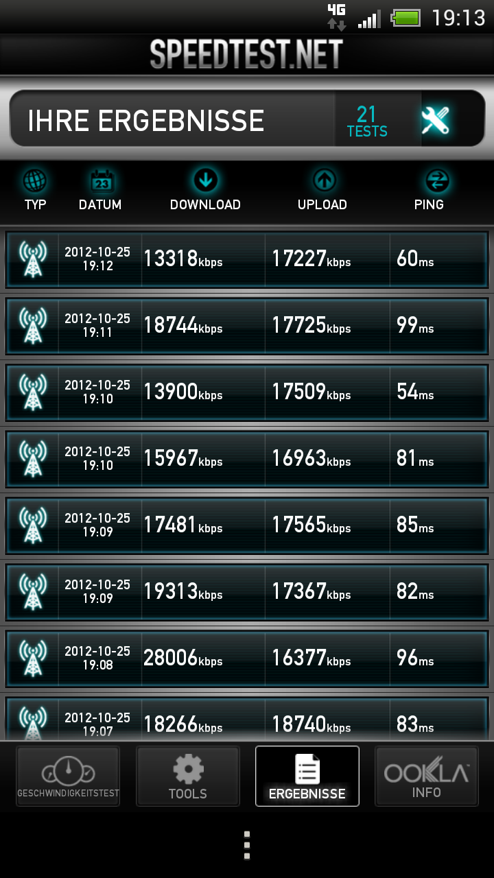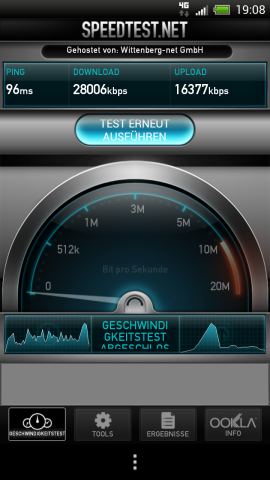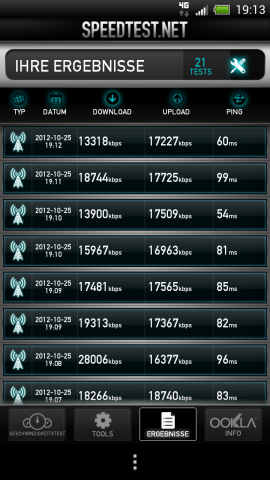 Nach diesen Abschweifungen zurück zum HTC One XL: Uns gefällt die schlanke Bauweise dank integrierten LTE-Modems im Vergleich zum HTC Velocity 4G mit separatem LTE-Modem. Einige Tester behaupten, das HTC One XL habe seine Schwierigkeiten bei der für Telefonate erforderlichen blitzschnellen Umschaltung zwischen LTE und GSM sowie beim Wechsel zwischen 3G- und 4G-Netz während zügiger Autofahrt (Sekundenlücken bei Netzumbuchung) und Probleme mit den Downloadraten. Das können wir nicht in vollem Umfang bestätigen. Was beim HTC Velocity 4G überhaupt nicht funktionierte – automatischer Wechsel zwischen 3G- und 4G-Netz – klappt beim HTC One XL hervorragend, zumindest während moderater Autofahrt oder bei Netzschwankungen im LTE-Randbereich; auch die Umschaltung zwischen LTE und GSM geht zügig vonstatten. Während sich die Uploadraten mit 16 bis 17 Mbit/s erstaunlich konstant zeigen, erreichen die LTE-Downloadraten zwar maximal hohe 28 Mbit/s, schwanken jedoch stark zwischen 10 Mbit/s und 23 Mbit/s, die für die meisten Zwecke dennoch mehr als ausreichend sind und geschwindigkeitsmäßig immer noch über so mancher DSL-Geschwindigkeit liegen. Das HTC Velocity 4G präsentierte sich demgegenüber trotz 3G/4G-Umschaltproblemen mit Downloadraten von max. 30 Mbit/s und ansonsten nur geringfügig schwankenden 25 Mbit/s insgesamt stabiler. Letztlich können wir nicht klären, ob das Downloadverhalten des HTC One XL netzwerk- (schwankende Auslastung) oder gerätebedingt ist. Es ist zwar wenig wahrscheinlich, dennoch nicht auszuschließen, dass bei den Tests des HTC Velocity 4G im Frühjahr 2012 das Vodafone-LTE-Netz noch nicht so beansprucht wie heute war.