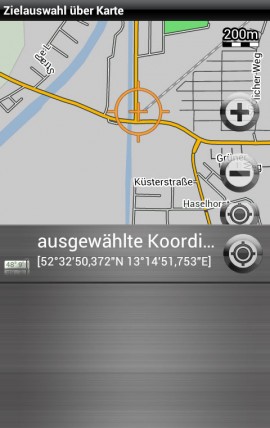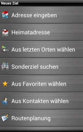 Die Reise beginnt wie immer mit der Eingabe einer Zieleingabe. Hier bietet MEDION diverse Möglichkeiten, welche über ein aufgeräumtes Hauptmenü schnell erreichbar sind. Neben der Eingabe einer Adresse ist auch die Suche und Auswahl von Sonderzielen, das Bestimmen eines Ziels aus der Karte oder die Eingabe von Koordinaten möglich. Sehr schön: Ziele werden oberhalb einer Kartenansicht eingegeben, welche dann den möglichen Zielort bereits vorab zeigt. Während der Eingabe werden ebenso vorgeschlagene Ziele in einer Liste angezeigt, was die Zielsuche beschleunigt. Leider können Ziele nicht im Querformat eingegeben werden, äußerst unpraktisch, wenn das Smartphone quer in einer Halterung steckt.