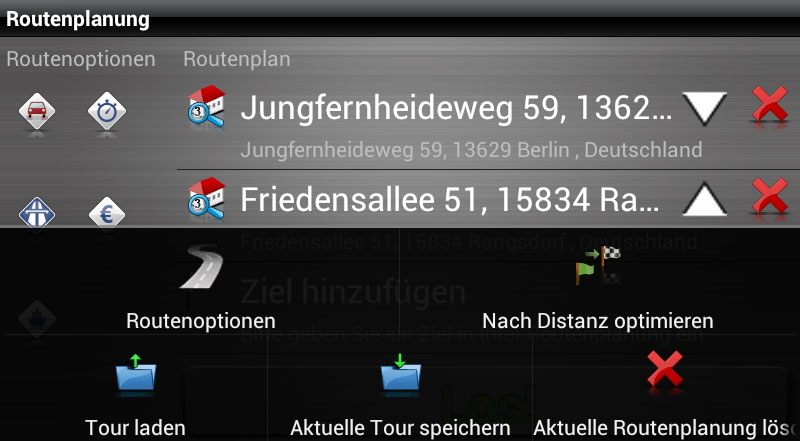 Eine Routenplanung mit Zwischenzielen ist möglich. Alle Routenpunkte lassen sich einfach erstellen, sortieren und löschen. Als Routen-Optionen stehen zur Verfügung: Fahrzeugtyp (Pkw, LKW, Motorrad, Fußgänger, Fahrrad), Routenart (kurz, schnell), Autobahn (vermeiden, ausschließen), Fähren (vermeiden, ausschließen). Eine Route kann gespeichert und später erneut geladen werden. Nach Berechnung ist auch eine Simulation möglich. Die Funktion um eine Route nach der Distanz zu optimieren ist etwas Versteckt erste durch das Drücken der Optionstaste des Smartphones zu erreichen. Dieses Feature ist immer dann sinnvoll, wenn man z.B. als Vertreter eine ganze Reihe von Kunden anfahren muss und die Reihenfolge unwichtig ist.