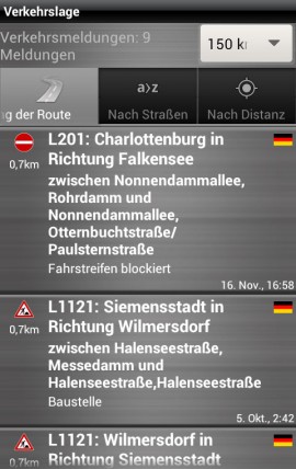 Ohne Aufpreis stellt MEDION auch einen Verkehrsservice zur Verfügung. Die Daten werden über eine mobile Datenverbindung von NAVTEQ bezogen. Zurzeit werden allerdings noch keine Echtzeit-Verkehrsflussdaten berücksichtigt, sondern lediglich normale Verkehrsmeldungen. Vor dem Fahrtantritt überprüft die App diese und liest auf der Route befindliche Störungen vor. Alle Meldungen sind auch noch einmal, nach verschiedenen Attributen geordnet, über einen eigenen Menüpunkt einsehbar. Bedauerlicherweise werden Verkehrsstörungen nur auf einer speziellen Ansicht in der Karte angezeigt, im normalen Navigationsmodus erfolgt noch keine Darstellung von Verkehrsstörungen. Sollte man einmal in einen Stau geraten, der nicht erfasst ist, lässt sich die voraus liegende Strecke auch sperren, der GoPal Navigator berechnet dann eine Ausweichroute.