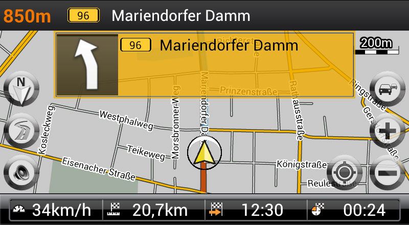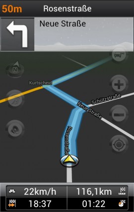 Das Verschieben und Zoomen auf der Karte ist dank Unterstützung der passenden Gesten kein Problem, sogar das Drehen der Karte ist damit möglich. Um auch während der Navigation das Zoomlevel sicher ändern zu können, befinden sich +/- Buttons auf der Karte, die bei Nicht-Benutzung transparent dargestellt werden und den Blick auf die Karte freigeben. Genauso verhalten sich auch weitere Schaltflächen, die links und rechts vom Display angeordnet sind und diverse Einstellungen ermöglichen.