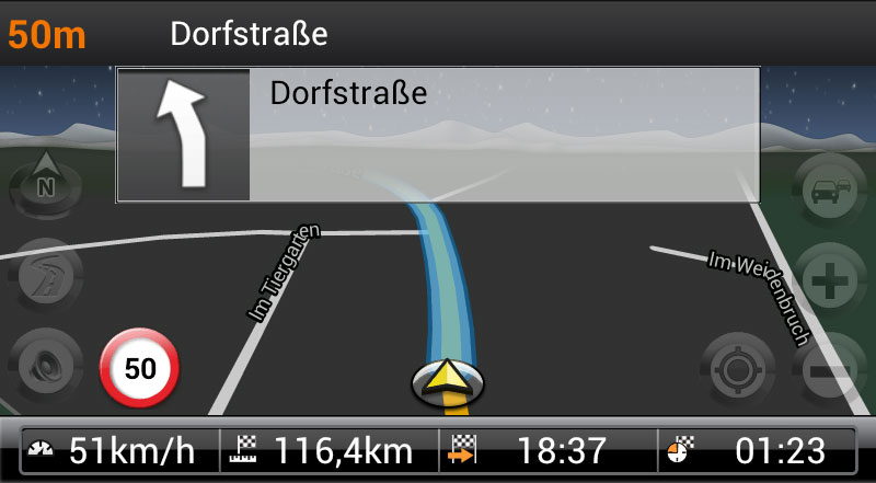 Die übersichtliche Kartendarstellung ist nur im Hochformat zu empfehlen, im Querformat nehmen die Schilder, welche vor einer Abbiegung eingeblendet werden, zu viel Platz auf dem Bildschirm ein und versperren die Sicht auf die vorausliegende Strecke. Ganz besonders fällt dies in der 3D-Darstellung auf.
