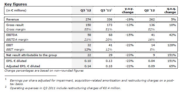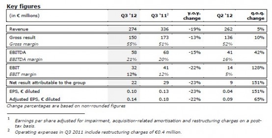 Den öffentlichen Zahlen zufolge sank der Gewinn des dritten Quartals im Jahresvergleich um 23 Prozent von 29 Millionen auf 22 Millionen Euro, der Umsatz fiel gleichzeitig um 19 Prozent im Vergleich zum Vorjahresquartal von 336 Millionen Euro auf 274 Millionen Euro.