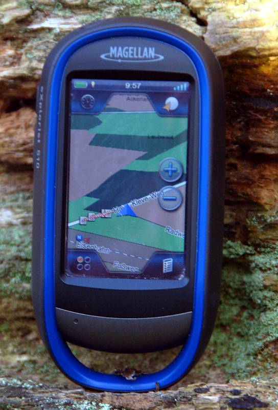 Mit seinem transflektiven 3-Zoll-Bildschirm und einer Auflösung von 240 x 400 Pixeln ist der eXplorist 510 ein typischer Vertreter der Mittelklasse mobiler Navigatoren. Die Helligkeit des Touchscreens ist sechsstufig einstellbar, das benötigte Menü erhält man unterwegs praktischerweise durch kurze Betätigung des Betriebsschalters. Bei eingeschalteter Hintergrundbeleuchtung konnte die Leuchtkraft des Displays durchwegs überzeugen, ganz ohne Hintergrundbeleuchtung und der Sonne direkt auf dem Display stehend geht es auch. Bei maximaler Leuchtkraft lässt sich der transflektive Bildschirm unter Sonnenschein in nahezu jeder Halteposition gut ablesen. Die von Smartphones bekannte Situation, dass das Display bei sehr hellen Lichtverhältnissen nicht mehr zu erkennen ist, bleibt dem Nutzer beim Magellan erspart.