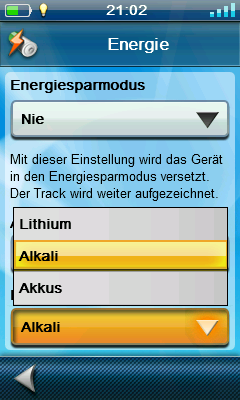 Die verschiedentlich im Internet zu lesenden Schilderungen von sich schnell entleerenden Batterien ließen sich während des Tests nicht verifizieren. Es mag aber durchaus vorkommen, dass der eXplorist mit bestimmten Batterien Probleme hat. Doch gibt es im Bedarfsfall genügend alternative Energieträger, die nachweislich zuverlässig funktionieren. Nutzt man moderne NiMH-Akkus mit niedriger Selbstentladung (Sanyo Eneloop o.ä.), empfehlen erfahrene Nutzer im Menü die Einstellung „Alkali“, da dieses Energieentladeprofil besser zu diesen Akkus passt.