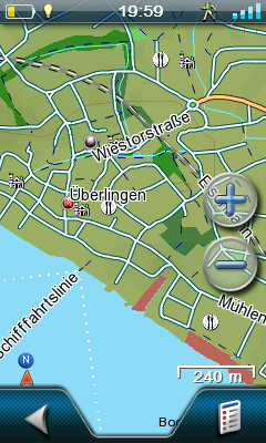 Durch Antippen des Bildschirms im Betrieb erscheinen in den vier Ecken des Displays kleine Schaltflächen: Unten links startet man das Menü, rechts daneben das Optionen-Menü, welches in vielen Ansichten gerade relevante Befehle zur Verfügung stellt. Oben links findet sich eine Dashboard-Ansicht der ermittelten Navigationsdaten und daneben ein frei gestaltbares Shortcut-Menü. Letzteres ist praktisch, wenn man bestimmte Menüpunkte regelmäßig benötigt.