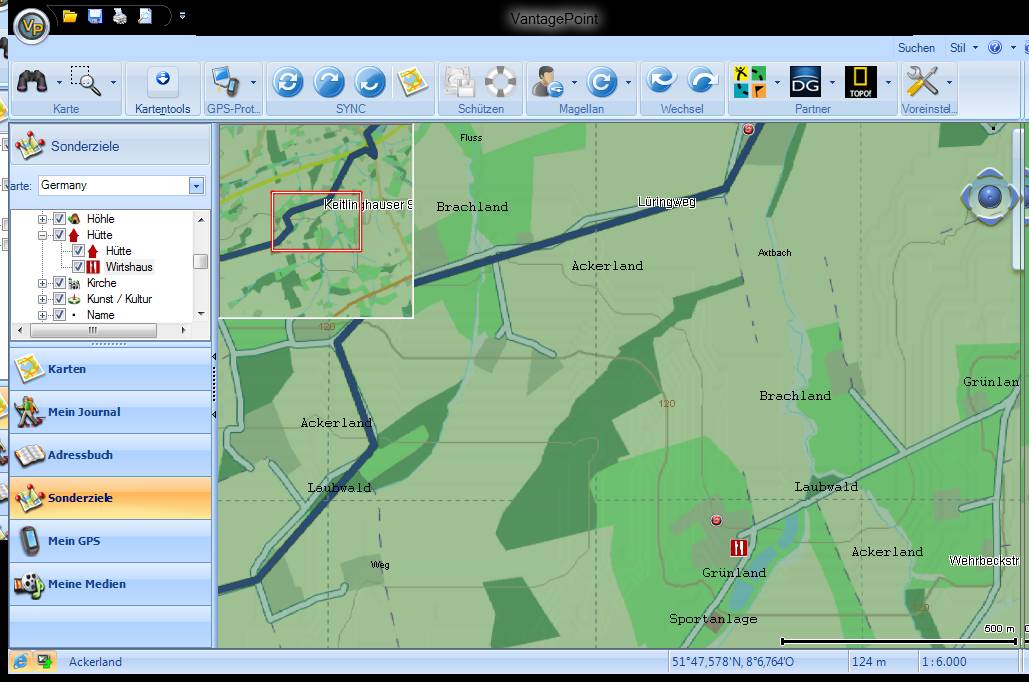Wie in dieser Gerätekategorie üblich, muss die Verwaltung der Wegpunkte und -strecken sowie Medienaufzeichnungen nicht über das notgedrungen kleine Mäusekino des eXplorist erfolgen, alternativ stellt Magellan als deutlich komfortablere Lösung die PC-Software VantagePoint zur Verfügung. Diese wiederum greift auf den bekannten Geodatenkonverter GPSBabel zurück. Über VantagePoint können nicht bloß die eigenen Karten und Geodaten verwaltet werden, gleichzeitig stellt die Software auch eine Schnittstelle zu externen Anbietern dar, z.B. Geocaching.com. Sofern man ein Premium-Konto bei diesem Anbieter besitzt, lässt sich der Navigator auf diese Weise einfach daran anbinden.