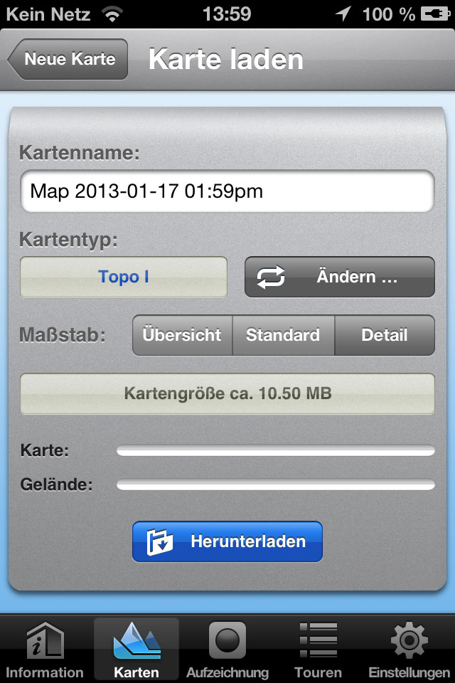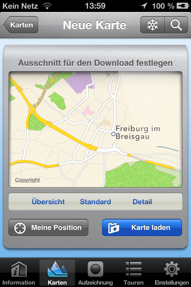 Die weltweiten OpenStreeMaps-Karten stehen wie erwähnt online und offline zur Verfügung. Während die Onlinekarten jeder Zeit über eine Mobilfunkverbindung abgerufen werden können, müssen die Offlinekarten vor dem Start der Tour auf das Smartphone oder Tablet geladen werden. Dies empfiehlt sich vor allem dann, wenn eine Tour außerhalb von Großstädten geplant ist, wo meist keine oder keine ausreichende Online-Verbindung besteht. Auch bei Reisen ins Ausland sollten die benötigten Kartenausschnitte zuvor geladen werden.