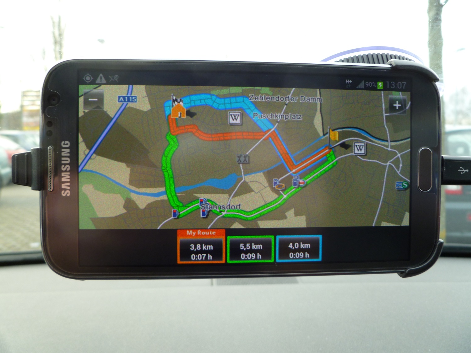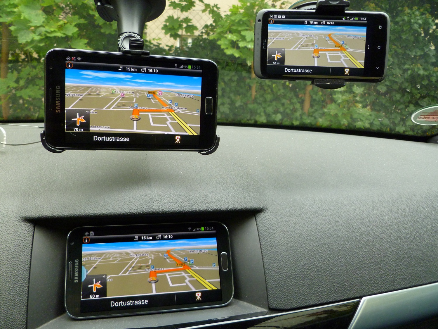 GPS und GLONASS sowie ein heller, gigantischer, 5,55 Zoll messender Touchscreen in HD-Auflösung, ein äußerst kräftiger Lautsprecher und geeignete Software schaffen beste Voraussetzungen für ein gelungenes Navigationssystem. Eine ungefähre Vorstellung von der Wirkung des Samsung Galaxy Note II Displays im Navibetrieb im Vergleich zu den nicht gerade kleinen Bildschirmen des Galaxy Note (5,3 Zoll) oder HTC One X/X+/XL (4,7 Zoll) verschafft das Folgende Foto (SGN links oben, SGN2 links unten, HTC One XL rechts oben).
