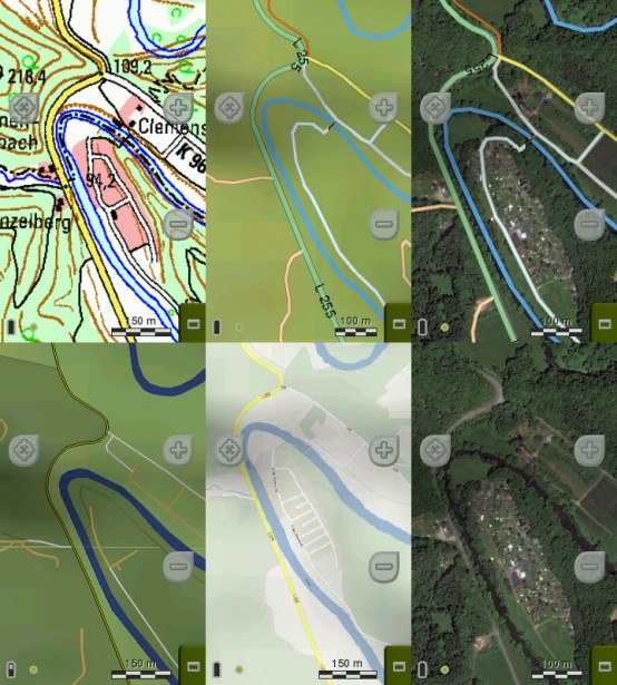 Von links nach rechts, oben nach unten: Topo 1:25.000, OSM-Karte mit Höhenmodell, Google Earth mit OSM-Karte, TomTom V-Maps u. Höhenmodell, Google Maps, Goople Earth.