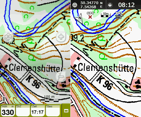 Wir haben die Darstellungsqualität der Topokarten 1:25.000 im Sportiva2 mit einem MEDION S3857 verglichen, da dieses Gerät die gleichen Kartendaten verwendet. Es fällt auf, dass das Sportiva2 die Darstellung mehr glättet als das MEDION. In nahen Zoomstufen wirkt die Karte des MEDION daher schärfer als die des Sportiva2. In mittleren Zoomstufen macht sich die Glättung jedoch sehr positiv bemerkbar. Während die Darstellung bei MEDION sehr pixelig und kaum noch nutzbar ist, zeigt die Karte des Sportiva2 eine gute Erkennbarkeit bei guter Übersicht. In weiten Zoomstufen liegt die TwoNav-Software deutlich vor der MEDION-GoPal-Outdoor-Software. Die TwoNav-Software wechselt im Gegensatz zur MEDION-Software zum richtigen Zeitpunkt in den Maßstab 1:100.000 bzw. 1:500.000 und ermöglicht so eine deutlich bessere Übersicht.